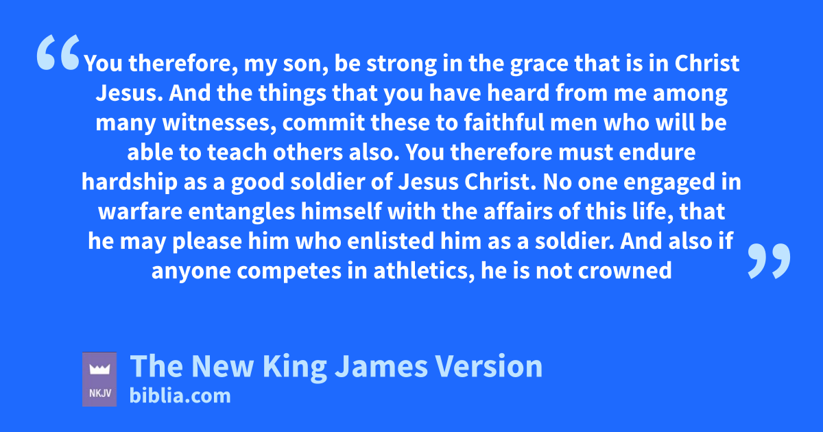 2 You therefore, amy son, bbe strong in the grace that is in Christ Jesus. 2 And the things that you have heard from me among many witnesses, commit these to faithful men who will be able to teach others also. 3 You therefore must cendure 1hardship das a good soldier of Jesus Christ. 4 eNo one engaged in warfare entangles himself with the affairs of this life, that he may please him who enlisted him as a soldier. 5 And also fif anyone competes in athletics, he is not crowned unless he competes according to the rules. 6 The hardworking farmer must be first to partake of the crops. 7 Consider what I say, and 2may the Lord ggive you understanding in all things.