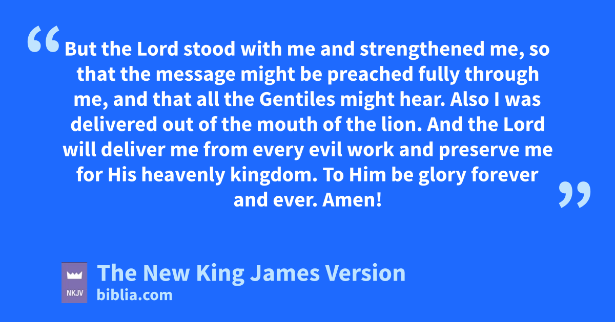 17 xBut the Lord stood with me and strengthened me, yso that the message might be preached fully through me, and that all the Gentiles might hear. Also I was delivered zout of the mouth of the lion. 18 aAnd the Lord will deliver me from every evil work and preserve me for His heavenly kingdom. bTo Him be glory forever and ever. Amen!