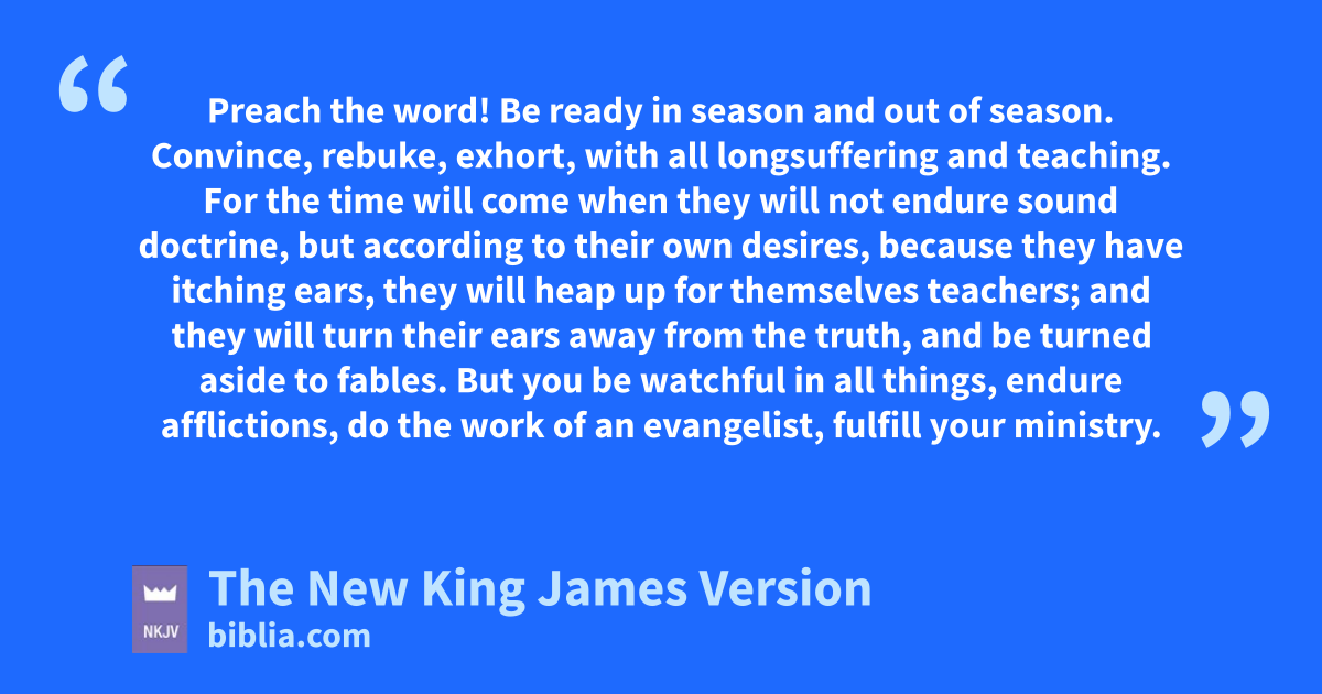 4 I acharge you 1therefore before God and the Lord Jesus Christ, bwho will judge the living and the dead 2at His appearing and His kingdom: 2 Preach the word! Be ready in season and out of season. cConvince, drebuke, eexhort, with all longsuffering and teaching. 3 fFor the time will come when they will not endure gsound doctrine, hbut according to their own desires, because they have itching ears, they will heap up for themselves teachers; 4 and they will turn their ears away from the truth, and ibe turned aside to fables. 5 But you be watchful in all things, jendure afflictions, do the work of kan evangelist, fulfill your ministry.
