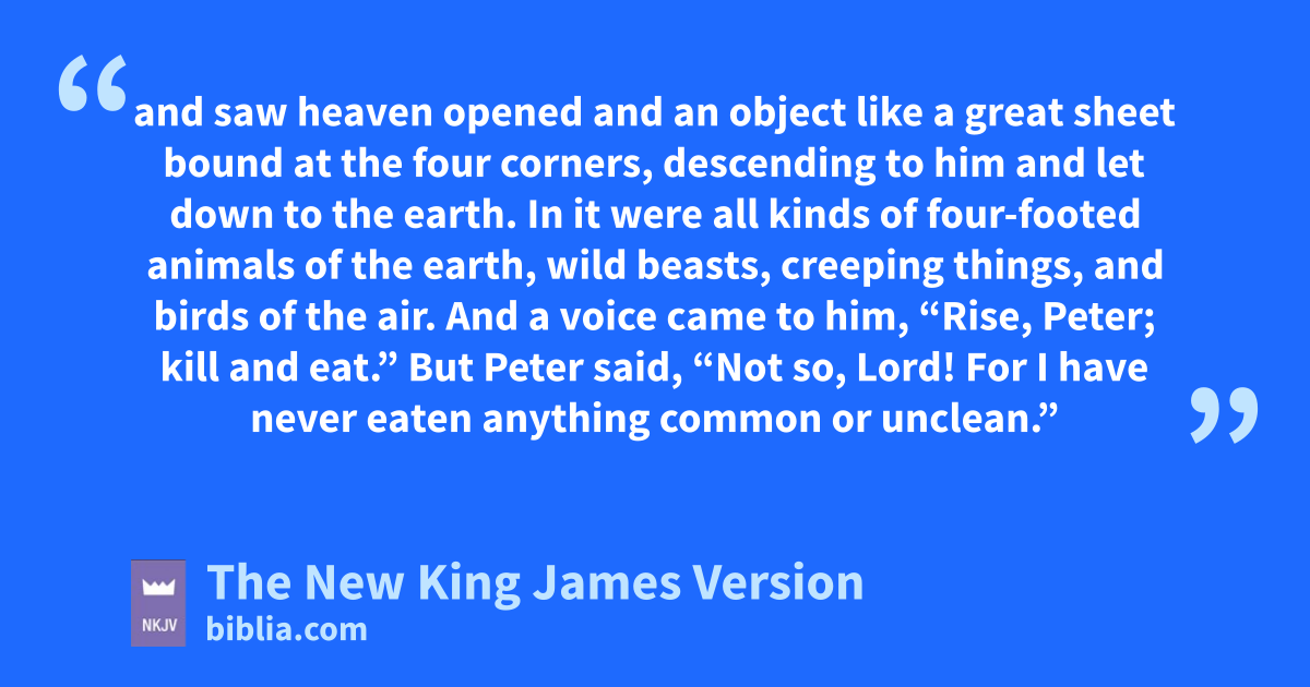 9 The next day, as they went on their journey and drew near the city, hPeter went up on the housetop to pray, about 5the sixth hour. 10 Then he became very hungry and wanted to eat; but while they made ready, he fell into a trance 11 and isaw heaven opened and an object like a great sheet bound at the four corners, descending to him and let down to the earth. 12 In it were all kinds of four-footed animals of the earth, wild beasts, creeping things, and birds of the air. 13 And a voice came to him, “Rise, Peter; kill and eat.”