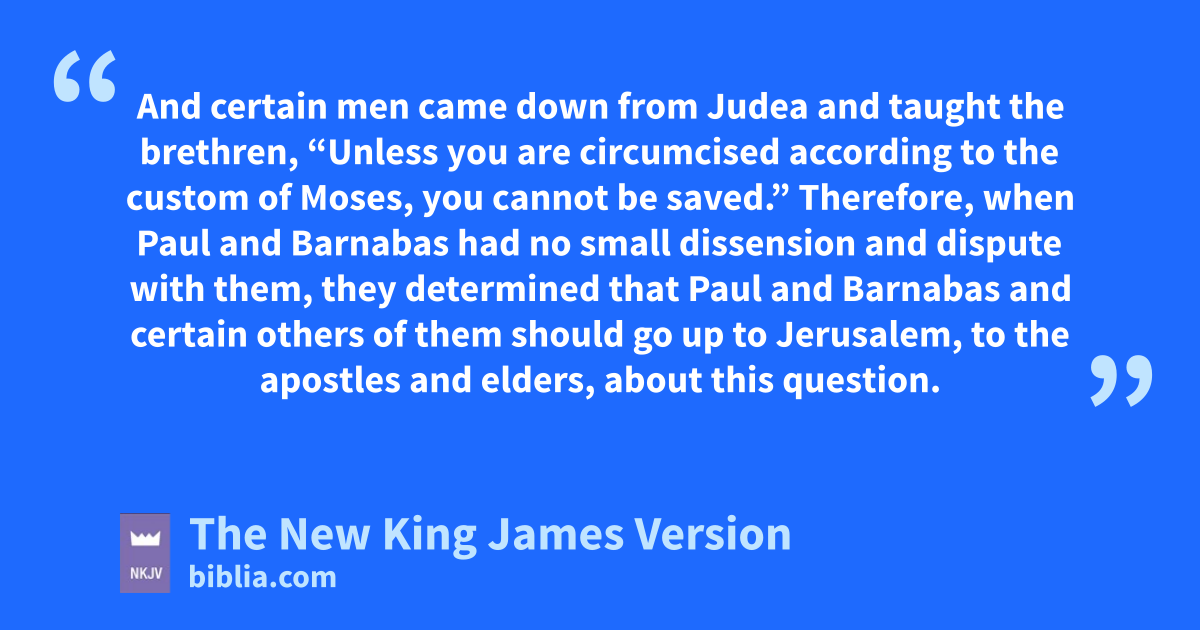 15 And acertain men came down from Judea and taught the brethren, b“Unless you are circumcised according to the custom of Moses, you cannot be saved.” 2 Therefore, when Paul and Barnabas had no small dissension and dispute with them, they determined that cPaul and Barnabas and certain others of them should go up to Jerusalem, to the apostles and elders, about this question.