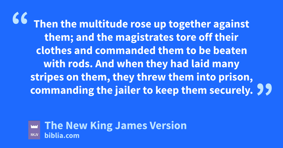 20 And they brought them to the magistrates, and said, “These men, being Jews, vexceedingly trouble our city; 21 and they teach customs which are not lawful for us, being Romans, to receive or observe.” 22 Then the multitude rose up together against them; and the magistrates tore off their clothes wand commanded them to be beaten with rods. 23 And when they had laid many stripes on them, they threw them into prison, commanding the jailer to keep them securely. 24 Having received such a charge, he put them into the inner prison and fastened their feet in the stocks.