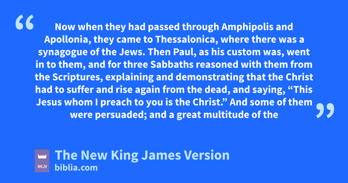 17 Now when they had passed through Amphipolis and Apollonia, they came to aThessalonica, where there was a synagogue of the Jews. 2 Then Paul, as his custom was, bwent in to them, and for three Sabbaths creasoned with them from the Scriptures, 3 explaining and demonstrating dthat the Christ had to suffer and rise again from the dead, and saying, “This Jesus whom I preach to you is the Christ.” 4 eAnd some of them were persuaded; and a great multitude of the devout Greeks, and not a few of the leading women, joined Paul and fSilas.