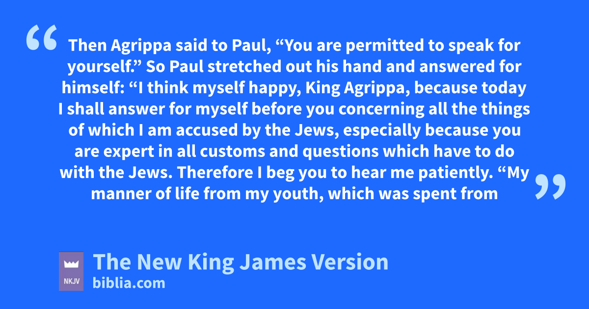 So Paul stretched out his hand and answered for himself: 2 “I think myself ahappy, King Agrippa, because today I shall answer bfor myself before you concerning all the things of which I am caccused by the Jews, 3 especially because you are expert in all customs and questions which have to do with the Jews. Therefore I beg you to hear me patiently.