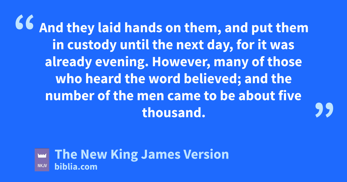 4 Now as they spoke to the people, the priests, the captain of the temple, and the aSadducees came upon them, 2 being greatly disturbed that they taught the people and preached in Jesus the resurrection from the dead. 3 And they laid hands on them, and put them in custody until the next day, for it was already evening. 4 However, many of those who heard the word believed; and the number of the men came to be about five thousand.