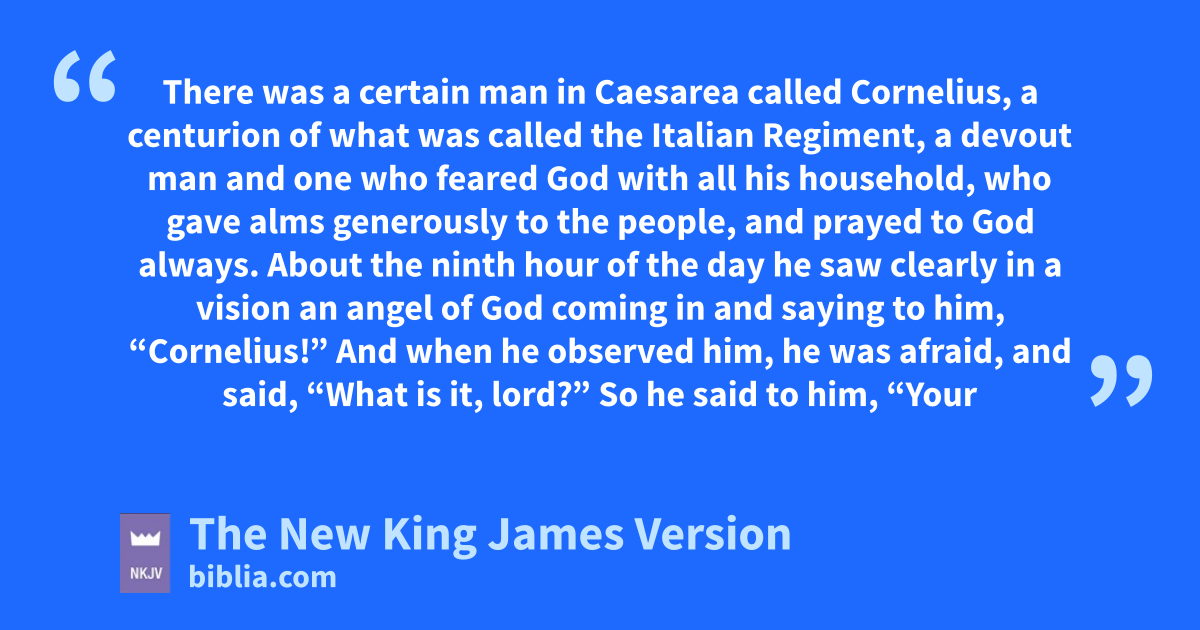 10 There was a certain man in aCaesarea called Cornelius, a centurion of what was called the Italian 1Regiment, 2 ba devout man and one who cfeared God with all his household, who gave 2alms generously to the people, and prayed to God always. 3 About 3the ninth hour of the day dhe saw clearly in a vision an angel of God coming in and saying to him, “Cornelius!”