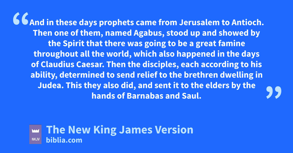 27 And in these days xprophets came from Jerusalem to Antioch. 28 Then one of them, named yAgabus, stood up and showed by the Spirit that there was going to be a great famine throughout all the world, which also happened in the days of zClaudius Caesar. 29 Then the disciples, each according to his ability, determined to send arelief to the brethren dwelling in Judea. 30 bThis they also did, and sent it to the elders by the hands of Barnabas and Saul.