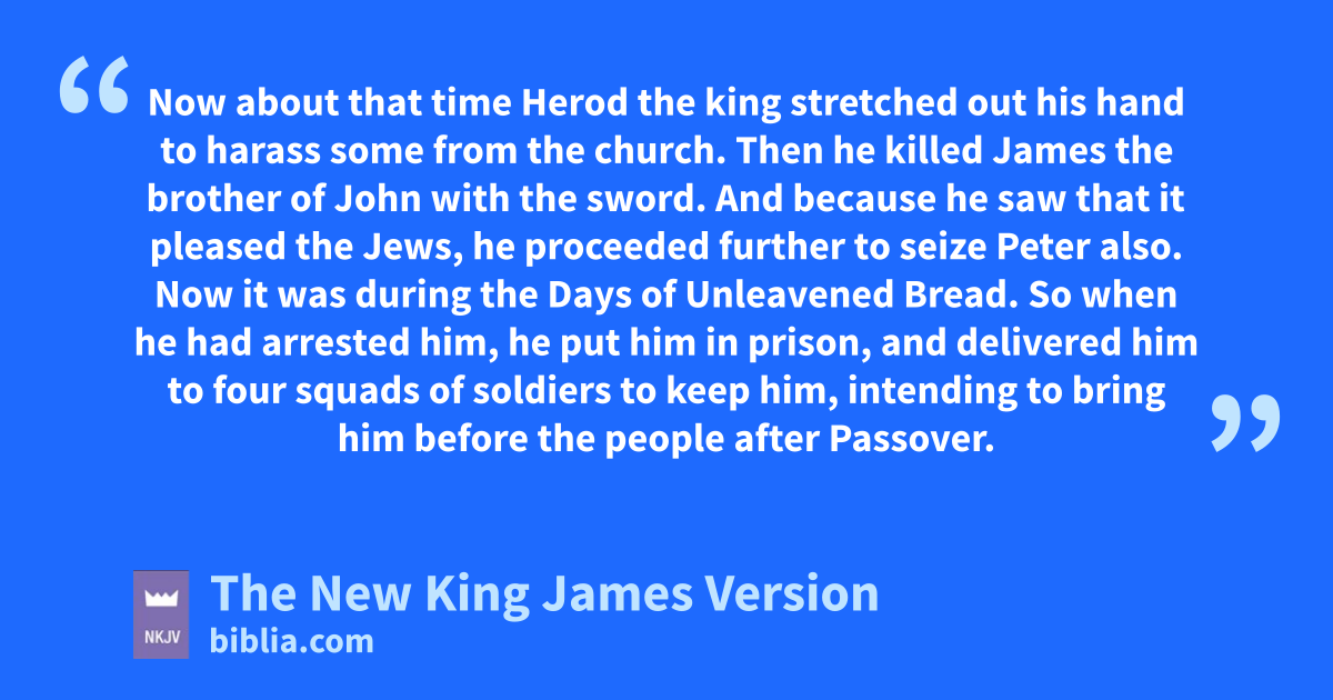 12 Now about that time Herod the king stretched out his hand to harass some from the church. 2 Then he killed James athe brother of John with the sword. 3 And because he saw that it pleased the Jews, he proceeded further to seize Peter also. Now it was during bthe Days of Unleavened Bread. 4 So cwhen he had arrested him, he put him in prison, and delivered him to four 1squads of soldiers to keep him, intending to bring him before the people after Passover.