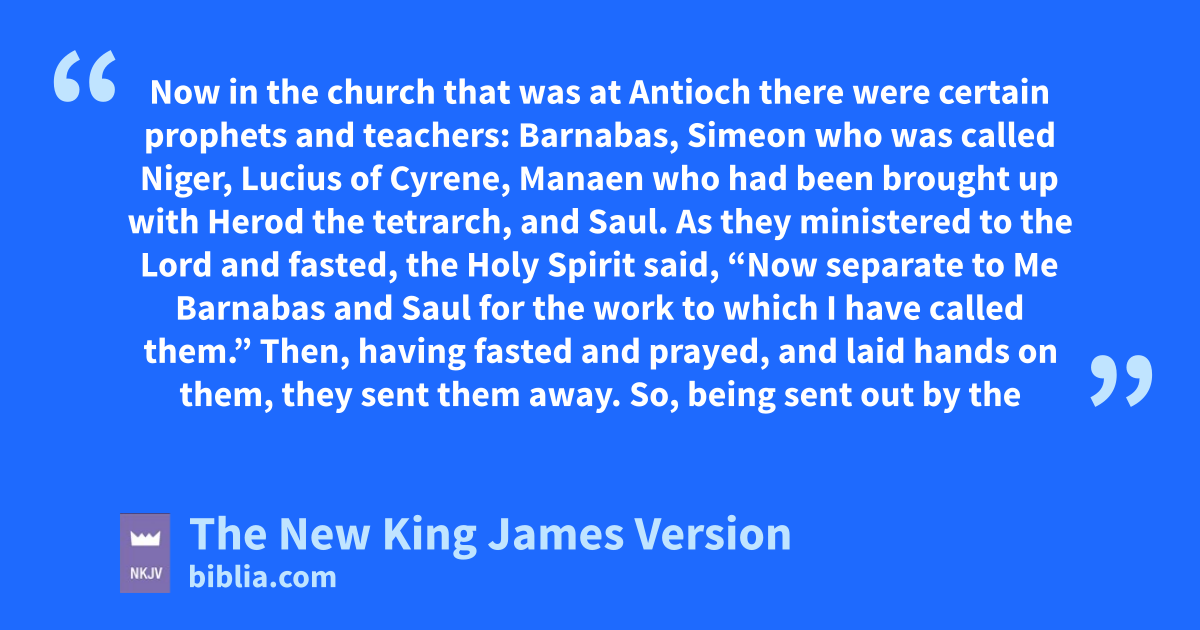 13 Now ain the church that was at Antioch there were certain prophets and teachers: bBarnabas, Simeon who was called Niger, cLucius of Cyrene, Manaen who had been brought up with Herod the tetrarch, and Saul. 2 As they ministered to the Lord and fasted, the Holy Spirit said, d“Now separate to Me Barnabas and Saul for the work eto which I have called them.” 3 Then, fhaving fasted and prayed, and laid hands on them, they sent them away.