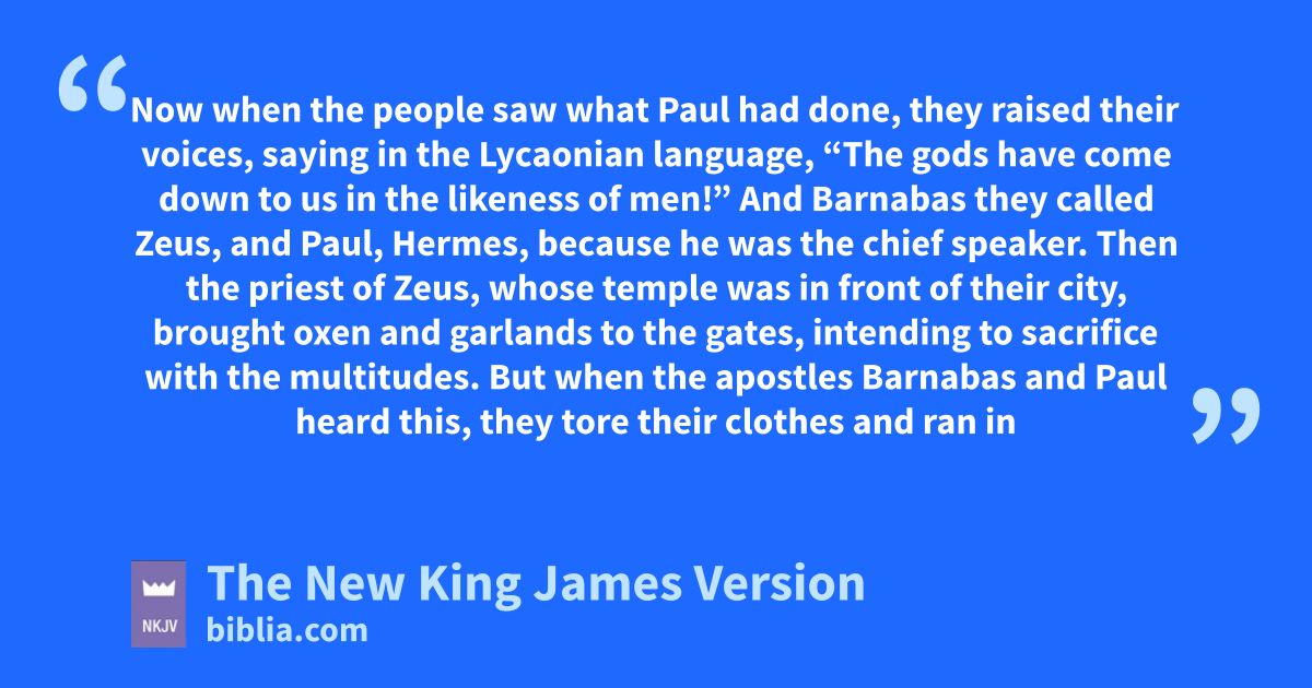 8 hAnd in Lystra a certain man without strength in his feet was sitting, a cripple from his mother’s womb, who had never walked. 9 This man heard Paul speaking. 3Paul, observing him intently and seeing that he had faith to be healed, 10 said with a loud voice, i“Stand up straight on your feet!” And he leaped and walked. 11 Now when the people saw what Paul had done, they raised their voices, saying in the Lycaonian language, j“The gods have come down to us in the likeness of men!” 12 And Barnabas they called 4Zeus, and Paul, 5Hermes, because he was the chief speaker. 13 Then the priest of Zeus, whose temple was in front of their city, brought oxen and garlands to the gates, kintending to sacrifice with the multitudes.
