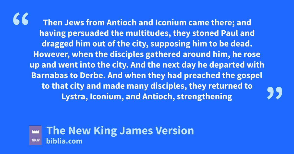 19 vThen Jews from Antioch and Iconium came there; and having persuaded the multitudes, wthey stoned Paul and dragged him out of the city, supposing him to be xdead. 20 However, when the disciples gathered around him, he rose up and went into the city. And the next day he departed with Barnabas to Derbe.