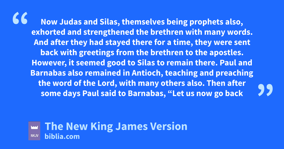 30 So when they were sent off, they came to Antioch; and when they had gathered the multitude together, they delivered the letter. 31 When they had read it, they rejoiced over its encouragement. 32 Now Judas and Silas, themselves being eprophets also, fexhorted and strengthened the brethren with many words. 33 And after they had stayed there for a time, they were gsent back with greetings from the brethren to 2the apostles.
