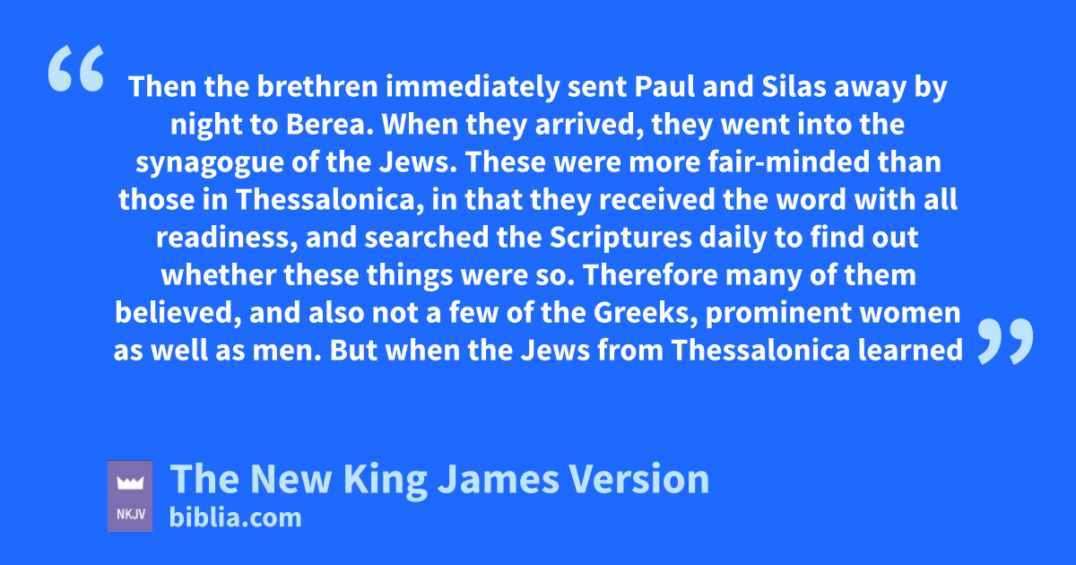 10 Then kthe brethren immediately sent Paul and Silas away by night to Berea. When they arrived, they went into the synagogue of the Jews. 11 These were more 4fair-minded than those in Thessalonica, in that they received the word with all readiness, and lsearched the Scriptures daily to find out whether these things were so. 12 Therefore many of them believed, and also not a few of the Greeks, prominent women as well as men. 13 But when the Jews from Thessalonica learned that the word of God was preached by Paul at Berea, they came there also and stirred up the crowds. 14 mThen immediately the brethren sent Paul away, to go to the sea; but both Silas and Timothy remained there. 15 So those who conducted Paul brought him to Athens; and nreceiving a command for Silas and Timothy to come to him with all speed, they departed.