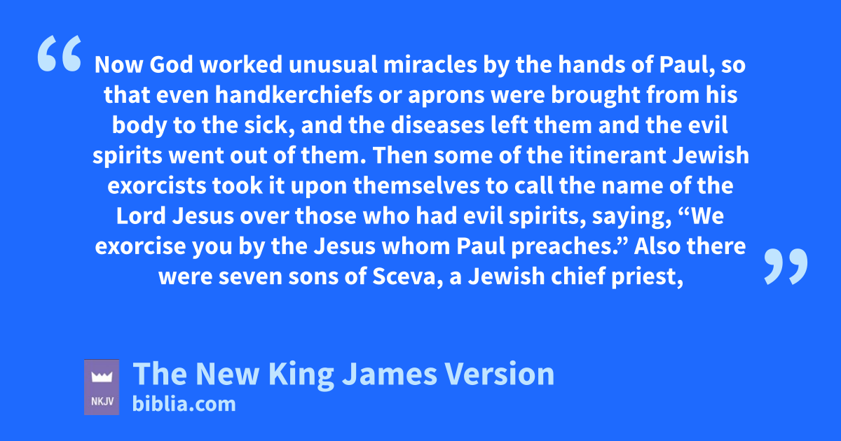 11 Now nGod worked unusual miracles by the hands of Paul, 12 oso that even handkerchiefs or aprons were brought from his body to the sick, and the diseases left them and the evil spirits went out of them. 13 pThen some of the itinerant Jewish exorcists qtook it upon themselves to call the name of the Lord Jesus over those who had evil spirits, saying, 1“We 2exorcise you by the Jesus whom Paul rpreaches.” 14 Also there were seven sons of Sceva, a Jewish chief priest, who did so.