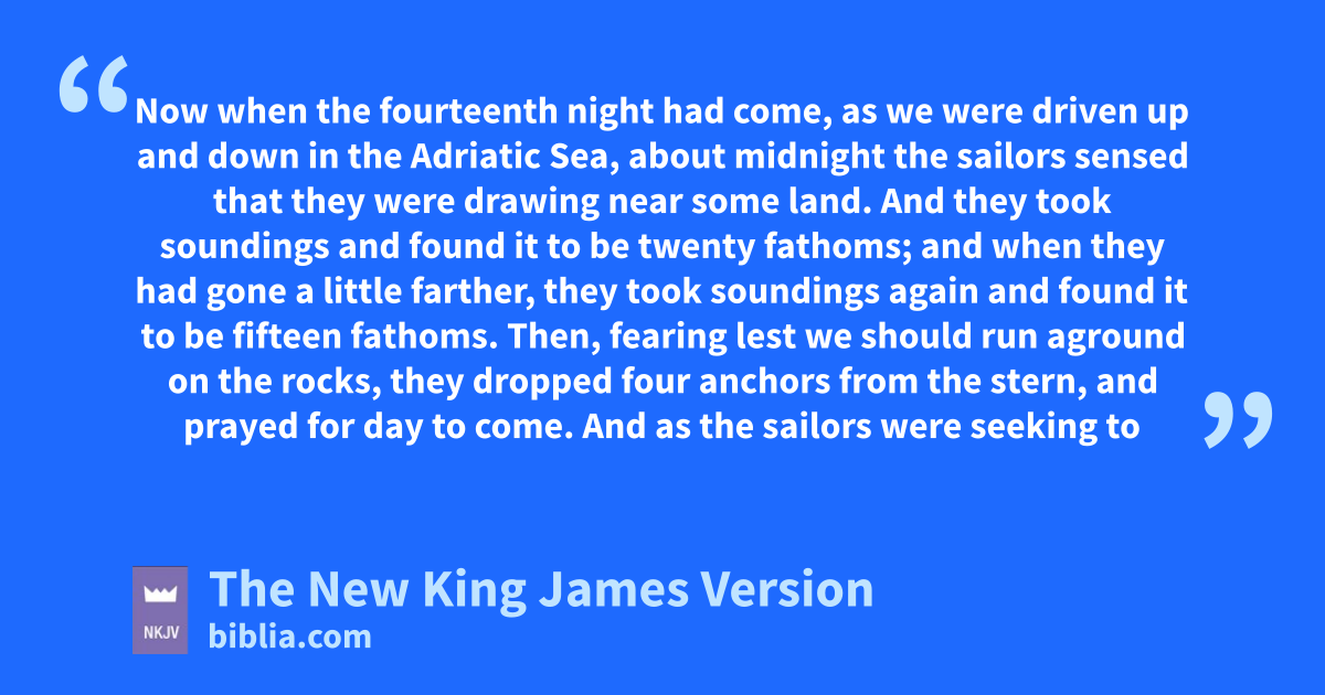 27 Now when the fourteenth night had come, as we were driven up and down in the Adriatic Sea, about midnight the sailors sensed that they were drawing near some land. 28 And they took soundings and found it to be twenty fathoms; and when they had gone a little farther, they took soundings again and found it to be fifteen fathoms. 29 Then, fearing lest we should run aground on the rocks, they dropped four anchors from the stern, and 7prayed for day to come. 30 And as the sailors were seeking to escape from the ship, when they had let down the skiff into the sea, under pretense of putting out anchors from the prow, 31 Paul said to the centurion and the soldiers, “Unless these men stay in the ship, you cannot be saved.” 32 Then the soldiers cut away the ropes of the skiff and let it fall off.
