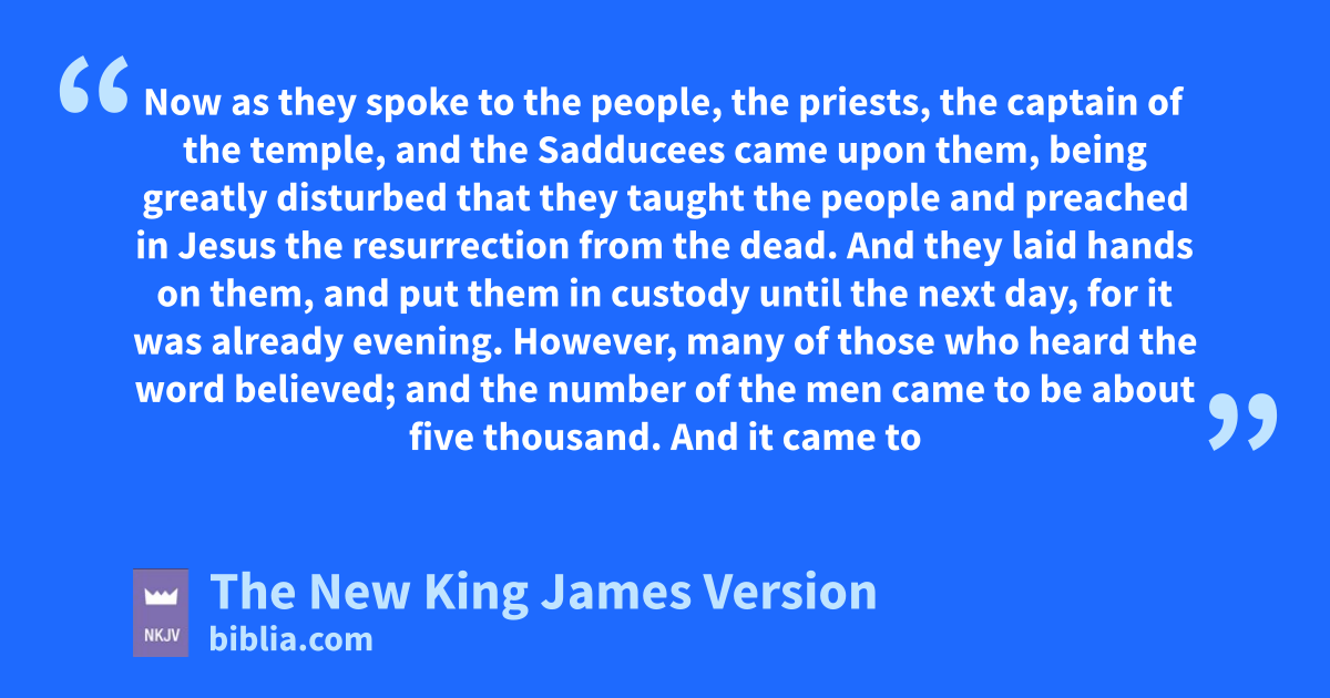 4 Now as they spoke to the people, the priests, the captain of the temple, and the aSadducees came upon them, 2 being greatly disturbed that they taught the people and preached in Jesus the resurrection from the dead. 3 And they laid hands on them, and put them in custody until the next day, for it was already evening. 4 However, many of those who heard the word believed; and the number of the men came to be about five thousand.