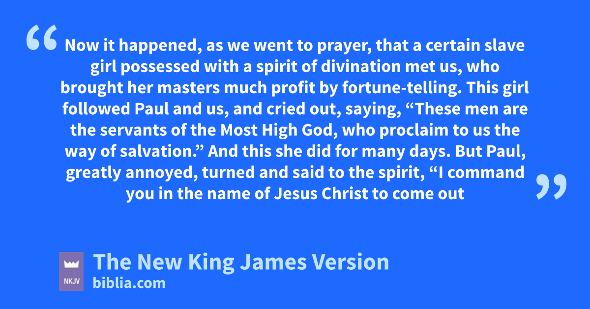 16 Now it happened, as we went to prayer, that a certain slave girl ppossessed with a spirit of divination met us, who brought her masters qmuch profit by fortune-telling. 17 This girl followed Paul and us, and cried out, saying, “These men are the servants of the Most High God, who proclaim to us the way of salvation.” 18 And this she did for many days.
