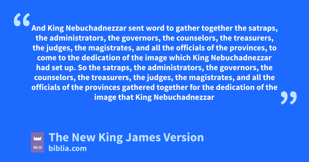 3 Nebuchadnezzar the king made an image of gold, whose height was 1sixty cubits and its width six cubits. He set it up in the plain of Dura, in the province of Babylon. 2 And King Nebuchadnezzar sent word to gather together the satraps, the administrators, the governors, the counselors, the treasurers, the judges, the magistrates, and all the officials of the provinces, to come to the dedication of the image which King Nebuchadnezzar had set up. 3 So the satraps, the administrators, the governors, the counselors, the treasurers, the judges, the magistrates, and all the officials of the provinces gathered together for the dedication of the image that King Nebuchadnezzar had set up; and they stood before the image that Nebuchadnezzar had set up. 4 Then a herald cried 2aloud: “To you it is commanded, aO peoples, nations, and languages, 5 that at the time you hear the sound of the horn, flute, harp, lyre, and psaltery, in symphony with all kinds of music, you shall fall down and worship the gold image that King Nebuchadnezzar has set up; 6 and whoever does not fall down and worship shall bbe cast immediately into the midst of a burning fiery furnace.”