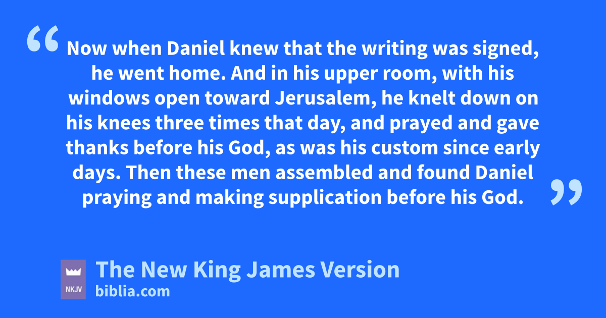 10 Now when Daniel knew that the writing was signed, he went home. And in his upper room, with his windows open ftoward Jerusalem, he knelt down on his knees gthree times that day, and prayed and gave thanks before his God, as was his custom since early days.