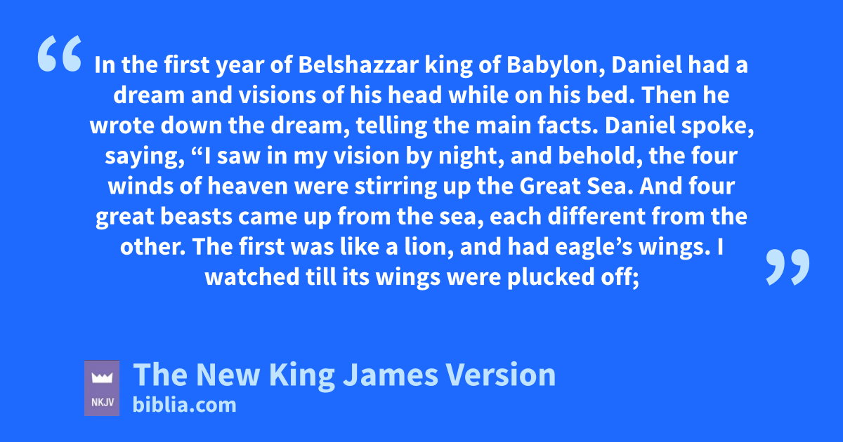 2 Daniel spoke, saying, “I saw in my vision by night, and behold, the four winds of heaven were stirring up the Great Sea. 3 And four great beasts ccame up from the sea, each different from the other. 4 The first was dlike a lion, and had eagle’s wings. I watched till its wings were plucked off; and it was lifted up from the earth and made to stand on two feet like a man, and a eman’s heart was given to it.