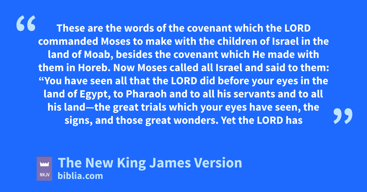 2 Now Moses called all Israel and said to them: b“You have seen all that the Lord did before your eyes in the land of Egypt, to Pharaoh and to all his servants and to all his land—3 cthe great trials which your eyes have seen, the signs, and those great wonders. 4 Yet dthe Lord has not given you a heart to 1perceive and eyes to see and ears to hear, to this very day. 5 eAnd I have led you forty years in the wilderness. fYour clothes have not worn out on you, and your sandals have not worn out on your feet. 6 gYou have not eaten bread, nor have you drunk wine or similar drink, that you may know that I am the Lord your God. 7 And when you came to this place, hSihon king of Heshbon and Og king of Bashan came out against us to battle, and we conquered them. 8 We took their land and igave it as an inheritance to the Reubenites, to the Gadites, and to half the tribe of Manasseh. 9 Therefore jkeep the words of this covenant, and do them, that you may kprosper in all that you do.