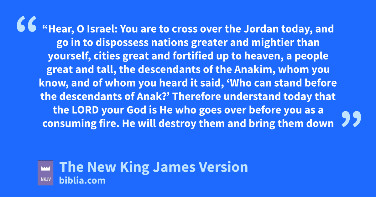 9 “Hear, O Israel: You are to cross over the Jordan today, and go in to dispossess nations greater and mightier than yourself, cities great and fortified up to heaven, 2 a people great and tall, the adescendants of the Anakim, whom you know, and of whom you heard it said, ‘Who can stand before the descendants of Anak?’ 3 Therefore understand today that the Lord your God is He who bgoes over before you as a cconsuming fire. dHe will destroy them and bring them down before you; eso you shall drive them out and destroy them quickly, as the Lord has said to you.