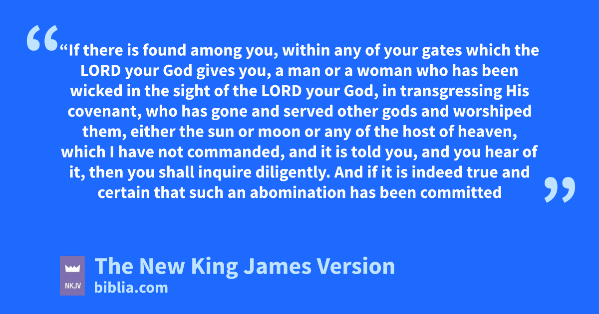 2 b“If there is found among you, within any of your 3gates which the Lord your God gives you, a man or a woman who has been wicked in the sight of the Lord your God, cin transgressing His covenant, 3 who has gone and served other gods and worshiped them, either dthe sun or moon or any of the host of heaven, ewhich I have not commanded, 4 fand it is told you, and you hear of it, then you shall inquire diligently. And if it is indeed true and certain that such an 4abomination has been committed in Israel, 5 then you shall bring out to your gates that man or woman who has committed that wicked thing, and gshall stone hto death that man or woman with stones. 6 Whoever is deserving of death shall be put to death on the testimony of two or three iwitnesses; he shall not be put to death on the testimony of one witness. 7 The hands of the witnesses shall be the first against him to put him to death, and afterward the hands of all the people. So you shall put away the evil from among jyou.