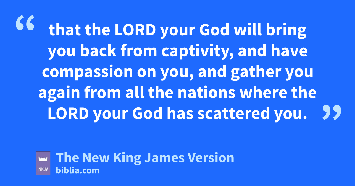 30 “Now ait shall come to pass, when ball these things come upon you, the blessing and the ccurse which I have set before you, and dyou 1call them to mind among all the nations where the Lord your God drives you, 2 and you ereturn to the Lord your God and obey His voice, according to all that I command you today, you and your children, with all your heart and with all your soul, 3 fthat the Lord your God will bring you back from captivity, and have compassion on you, and ggather you again from all the nations where the Lord your God has scattered you. 4 hIf any of you are driven out to the farthest parts under heaven, from there the Lord your God will gather you, and from there He will bring you. 5 Then the Lord your God will bring you to the land which your fathers possessed, and you shall possess it. He will prosper you and multiply you more than your fathers. 6 And ithe Lord your God will circumcise your heart and the heart of your descendants, to love the Lord your God with all your heart and with all your soul, that you may live.
