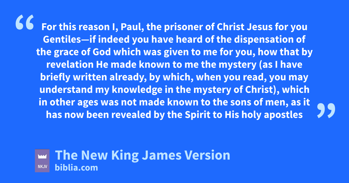 3 For this reason I, Paul, the prisoner of Christ Jesus for you Gentiles—2 if indeed you have heard of the 1dispensation of the grace of God awhich was given to me for you, 3 bhow that by revelation cHe made known to me the mystery (as I have briefly written already, 4 by which, when you read, you may understand my knowledge in the mystery of Christ), 5 which in other ages was not made known to the sons of men, as it has now been revealed by the Spirit to His holy apostles and prophets: 6 that the Gentiles dshould be fellow heirs, of the same body, and partakers of His promise in Christ through the gospel, 7 eof which I became a minister faccording to the gift of the grace of God given to me by gthe effective working of His power.