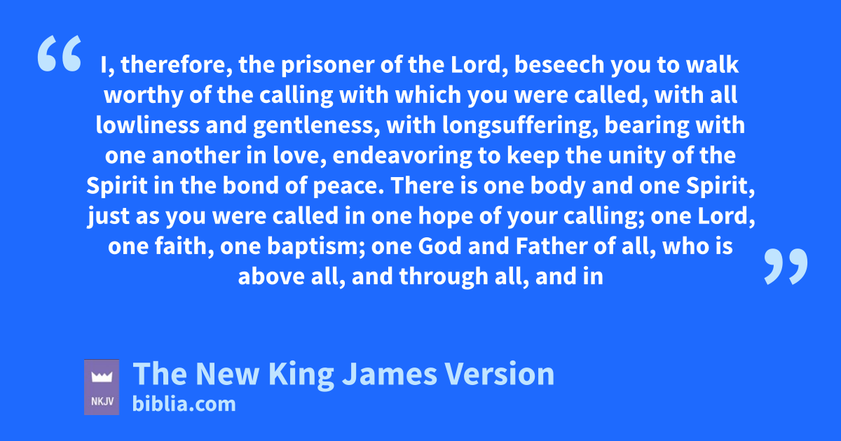 4 I, therefore, the prisoner 1of the Lord, 2beseech you to awalk worthy of the calling with which you were called, 2 with all lowliness and gentleness, with longsuffering, bearing with one another in love, 3 endeavoring to keep the unity of the Spirit bin the bond of peace. 4 cThere is one body and one Spirit, just as you were called in one hope of your calling; 5 done Lord, eone faith, fone baptism; 6 gone God and Father of all, who is above all, and hthrough all, and in 3you all.