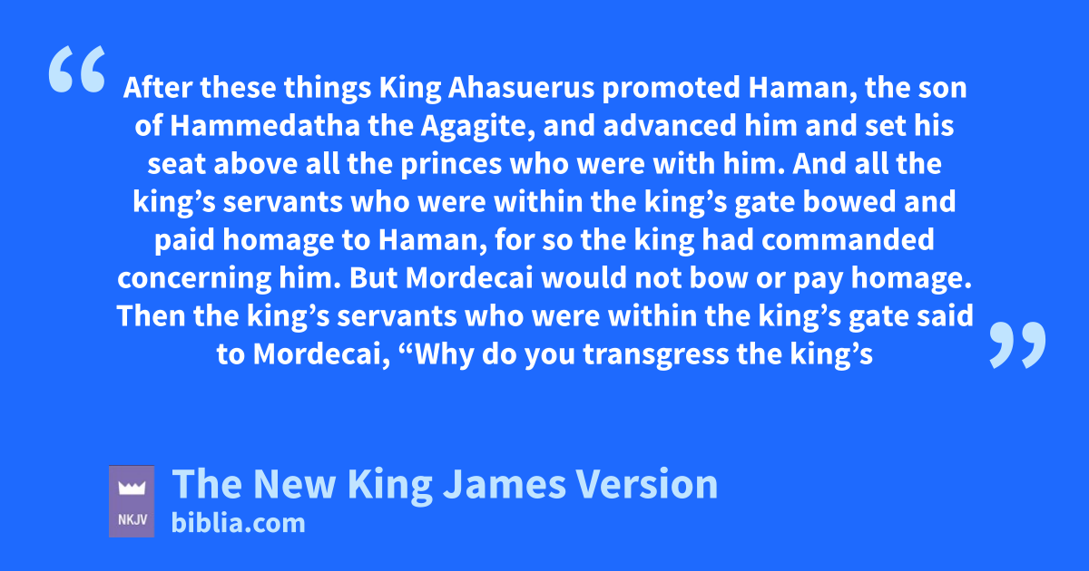 3 After these things King Ahasuerus promoted Haman, the son of Hammedatha the aAgagite, and badvanced him and set his seat above all the princes who were with him. 2 And all the king’s servants who were cwithin the king’s gate bowed and paid homage to Haman, for so the king had commanded concerning him. But Mordecai dwould not bow or pay homage. 3 Then the king’s servants who were within the king’s gate said to Mordecai, “Why do you transgress the eking’s command?” 4 Now it happened, when they spoke to him daily and he would not listen to them, that they told it to Haman, to see whether Mordecai’s words would stand; for Mordecai had told them that he was a Jew. 5 When Haman saw that Mordecai fdid not bow or pay him homage, Haman was gfilled with wrath. 6 But he disdained to lay hands on Mordecai alone, for they had told him of the people of Mordecai. Instead, Haman hsought to destroy all the Jews who were throughout the whole kingdom of Ahasuerus—the people of Mordecai.