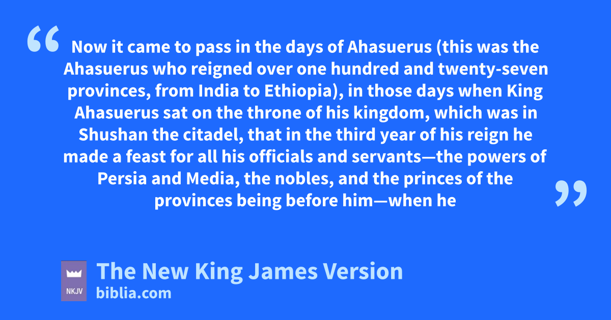 1 Now it came to pass in the days of aAhasuerus 1(this was the Ahasuerus who reigned bover one hundred and twenty-seven provinces, cfrom India to Ethiopia), 2 in those days when King Ahasuerus dsat on the throne of his kingdom, which was in eShushan 2the 3citadel, 3 that in the third year of his reign he fmade a feast for all his officials and servants—the powers of Persia and Media, the nobles, and the princes of the provinces being before him—4 when he showed the riches of his glorious kingdom and the splendor of his excellent majesty for many days, one hundred and eighty days in all.