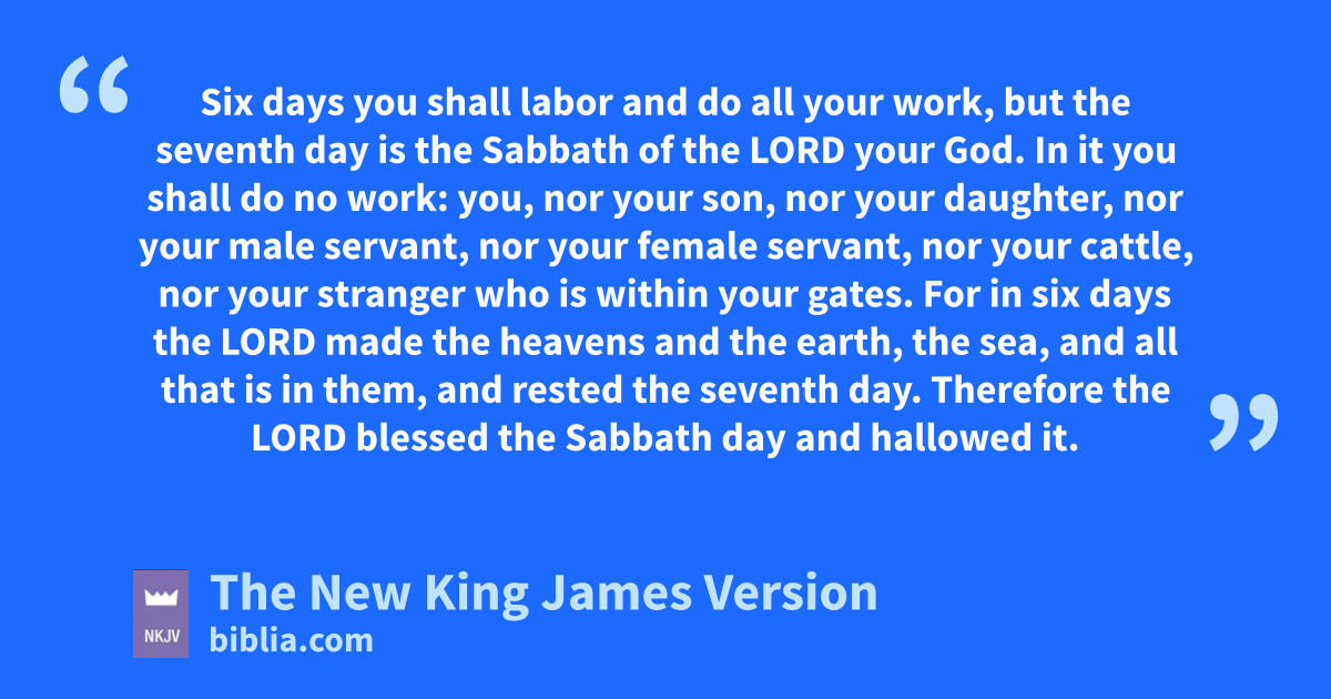 8 l“Remember the Sabbath day, to keep it holy. 9 mSix days you shall labor and do all your work, 10 but the nseventh day is the Sabbath of the Lord your God. In it you shall do no work: you, nor your son, nor your daughter, nor your male servant, nor your female servant, nor your cattle, onor your stranger who is within your gates. 11 For pin six days the Lord made the heavens and the earth, the sea, and all that is in them, and rested the seventh day. Therefore the Lord blessed the Sabbath day and hallowed it.