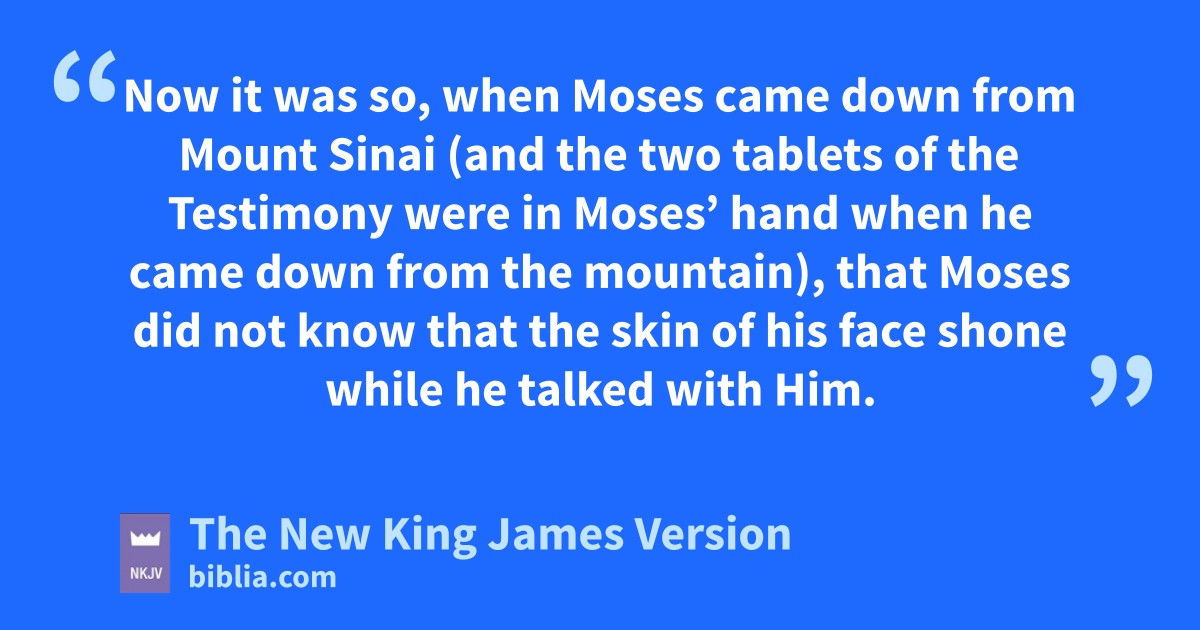 29 Now it was so, when Moses came down from Mount Sinai (and the utwo tablets of the Testimony were in Moses’ hand when he came down from the mountain), that Moses did not know that vthe skin of his face shone while he talked with Him. 30 So when Aaron and all the children of Israel saw Moses, behold, the skin of his face shone, and they were afraid to come near him. 31 Then Moses called to them, and Aaron and all the rulers of the congregation returned to him; and Moses talked with them. 32 Afterward all the children of Israel came near, wand he gave them as commandments all that the Lord had spoken with him on Mount Sinai. 33 And when Moses had finished speaking with them, he put xa veil on his face. 34 But ywhenever Moses went in before the Lord to speak with Him, he would take the veil off until he came out; and he would come out and speak to the children of Israel whatever he had been commanded. 35 And whenever the children of Israel saw the face of Moses, that the skin of Moses’ face shone, then Moses would put the veil on his face again, until he went in to speak with Him.