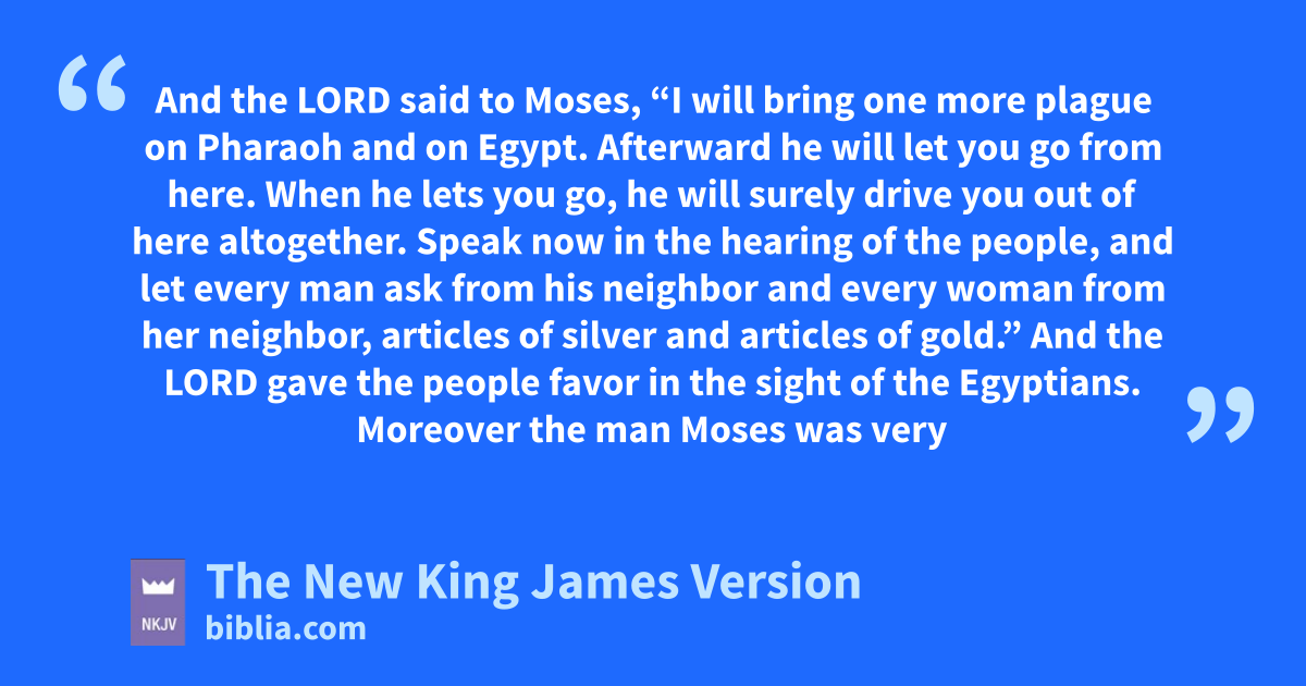 11 And the Lord said to Moses, “I will bring one more plague on Pharaoh and on Egypt. aAfterward he will let you go from here. bWhen he lets you go, he will surely drive you out of here altogether. 2 Speak now in the hearing of the people, and let every man ask from his neighbor and every woman from her neighbor, carticles of silver and articles of gold.” 3 dAnd the Lord gave the people favor in the sight of the Egyptians. Moreover the man eMoses was very great in the land of Egypt, in the sight of Pharaoh’s servants and in the sight of the people.
