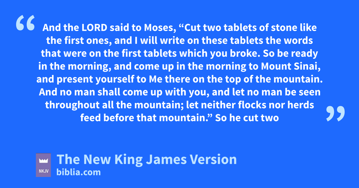 34 And the Lord said to Moses, a“Cut two tablets of stone like the first ones, and bI will write on these tablets the words that were on the first tablets which you broke. 2 So be ready in the morning, and come up in the morning to Mount Sinai, and present yourself to Me there con the top of the mountain. 3 And no man shall dcome up with you, and let no man be seen throughout all the mountain; let neither flocks nor herds feed before that mountain.”