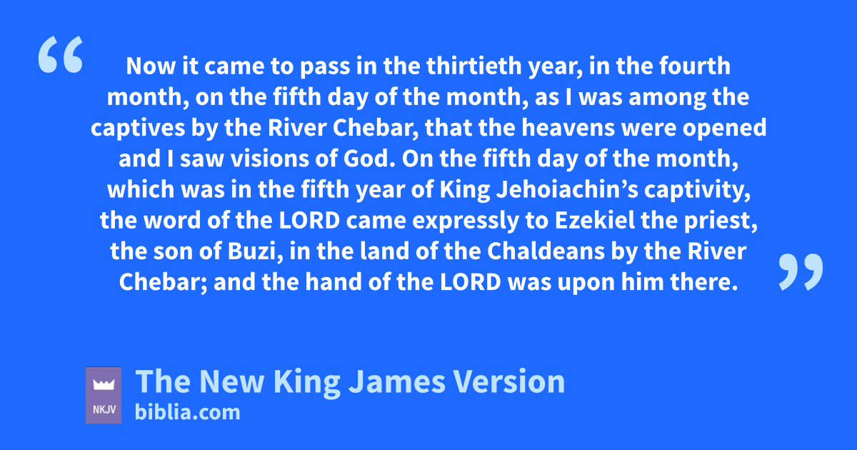 1 Now it came to pass in the thirtieth year, in the fourth month, on the fifth day of the month, as I was among the captives by athe River Chebar, that bthe heavens were opened and I saw cvisions 1of God. 2 On the fifth day of the month, which was in the fifth year of King Jehoiachin’s captivity, 3 the word of the Lord came expressly to Ezekiel the priest, the son of Buzi, in the land of the 2Chaldeans by the River Chebar; and dthe hand of the Lord was upon him there.