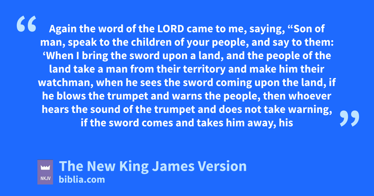33 Again the word of the Lord came to me, saying, 2 “Son of man, speak to athe children of your people, and say to them: b‘When I bring the sword upon a land, and the people of the land take a man from their territory and make him their cwatchman, 3 when he sees the sword coming upon the land, if he blows the trumpet and warns the people, 4 then whoever hears the sound of the trumpet and does dnot take warning, if the sword comes and takes him away, ehis blood shall be on his own head. 5 He heard the sound of the trumpet, but did not take warning; his blood shall be upon himself. But he who takes warning will 1save his life. 6 But if the watchman sees the sword coming and does not blow the trumpet, and the people are not warned, and the sword comes and takes any person from among them, fhe is taken away in his iniquity; but his blood I will require at the watchman’s hand.’