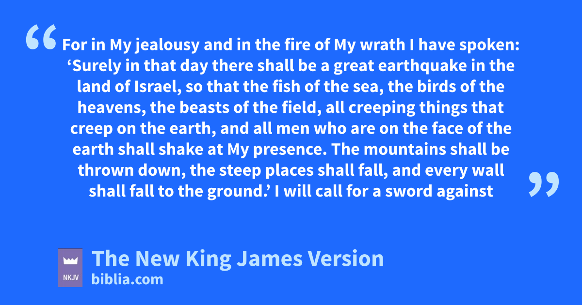 18 “And it will come to pass at the same time, when Gog comes against the land of Israel,” says the Lord God, “that My fury will show in My face. 19 For fin My jealousy gand in the fire of My wrath I have spoken: h‘Surely in that day there shall be a great 5earthquake in the land of Israel, 20 so that ithe fish of the sea, the birds of the heavens, the beasts of the field, all creeping things that creep on the earth, and all men who are on the face of the earth shall shake at My presence. jThe mountains shall be thrown down, the steep places shall fall, and every wall shall fall to the ground.’ 21 I will kcall for la sword against Gog throughout all My mountains,” says the Lord God. m“Every man’s sword will be against his brother. 22 And I will nbring him to judgment with opestilence and bloodshed; pI will rain down on him, on his troops, and on the many peoples who are with him, flooding rain, qgreat hailstones, fire, and brimstone. 23 Thus I will magnify Myself and rsanctify Myself, sand I will be known in the eyes of many nations. Then they shall know that I am the Lord.” ’