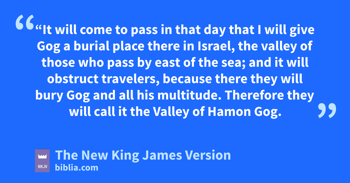 11 “It will come to pass in that day that I will give Gog a burial place there in Israel, the valley of those who pass by east of the sea; and it will obstruct travelers, because there they will bury Gog and all his multitude. Therefore they will call it the Valley of 7Hamon Gog. 12 For seven months the house of Israel will be burying them, nin order to cleanse the land. 13 Indeed all the people of the land will be burying, and they will gain orenown for it on the day that pI am glorified,” says the Lord God. 14 “They will set apart men regularly employed, with the help of 8a search party, to pass through the land and bury those bodies remaining on the ground, in order qto cleanse it. At the end of seven months they will make a search. 15 The search party will pass through the land; and when anyone sees a man’s bone, he shall 9set up a marker by it, till the buriers have buried it in the Valley of Hamon Gog. 16 The name of the city will also be 1Hamonah. Thus they shall rcleanse the land.” ’