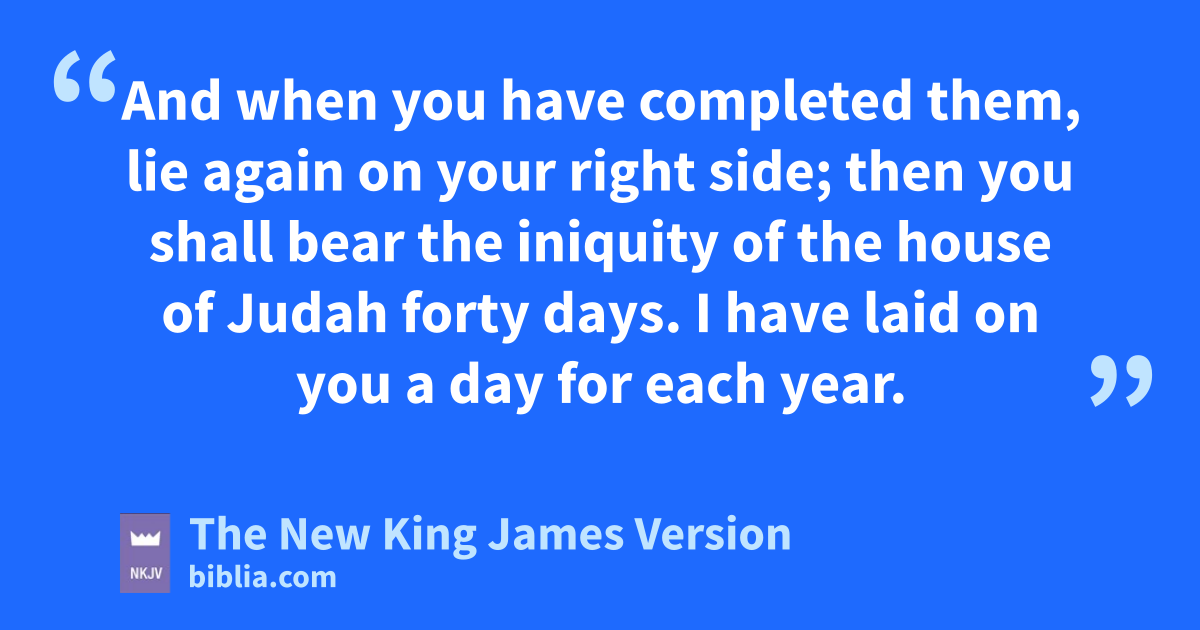 4 “Lie also on your left side, and lay the iniquity of the house of Israel upon it. According to the number of the days that you lie on it, you shall bear their iniquity. 5 For I have laid on you the years of their iniquity, according to the number of the days, three hundred and ninety days; eso you shall bear the iniquity of the house of Israel. 6 And when you have completed them, lie again on your right side; then you shall bear the iniquity of the house of Judah forty days. I have laid on you a day for each year.