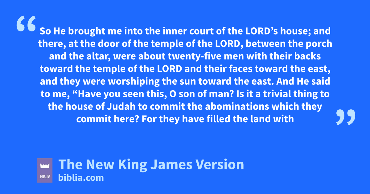 15 Then He said to me, “Have you seen this, O son of man? Turn again, you will see greater abominations than these.” 16 So He brought me into the inner court of the Lord’s house; and there, at the door of the temple of the Lord, qbetween the porch and the altar, rwere about twenty-five men swith their backs toward the temple of the Lord and their faces toward the east, and they were worshiping tthe sun toward the east.