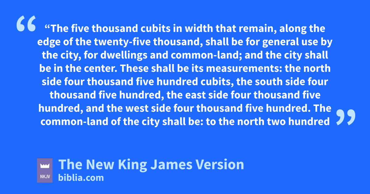 15 p“The five thousand cubits in width that remain, along the edge of the twenty-five thousand, shall be qfor general use by the city, for dwellings and common-land; and the city shall be in the center. 16 These shall be its measurements: the north side four thousand five hundred cubits, the south side four thousand five hundred, the east side four thousand five hundred, and the west side four thousand five hundred. 17 The common-land of the city shall be: to the north two hundred and fifty cubits, to the south two hundred and fifty, to the east two hundred and fifty, and to the west two hundred and fifty. 18 The rest of the length, alongside the district of the holy section, shall be ten thousand cubits to the east and ten thousand to the west. It shall be adjacent to the district of the holy section, and its produce shall be food for the workers of the city. 19 rThe workers of the city, from all the tribes of Israel, shall cultivate it. 20 The entire district shall be twenty-five thousand cubits by twenty-five thousand cubits, foursquare. You shall set apart the holy district with the property of the city.