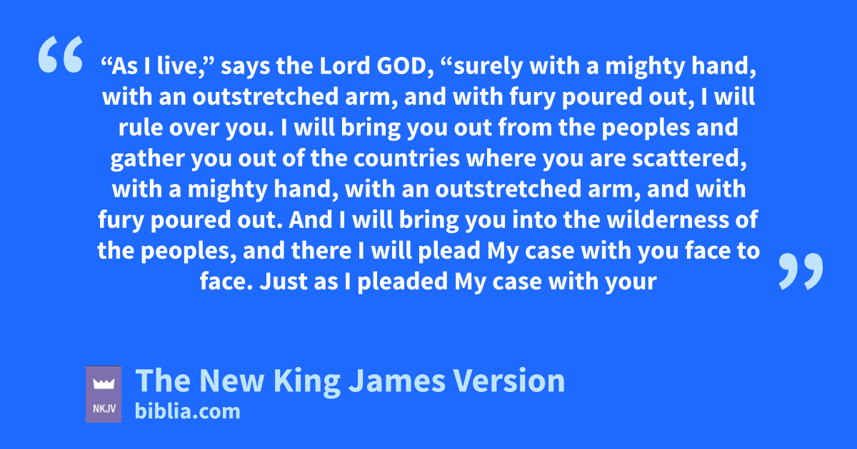 33 “As I live,” says the Lord God, “surely with a mighty hand, xwith an outstretched arm, and with fury poured out, I will rule over you. 34 I will bring you out from the peoples and gather you out of the countries where you are scattered, with a mighty hand, with an outstretched arm, and with fury poured out. 35 And I will bring you into the wilderness of the peoples, and there yI will plead My case with you face to face. 36 zJust as I pleaded My case with your fathers in the wilderness of the land of Egypt, so I will plead My case with you,” says the Lord God.