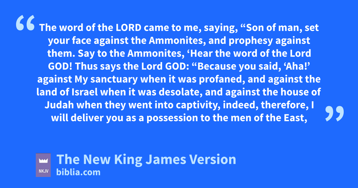 25 The word of the Lord came to me, saying, 2 “Son of man, aset your face bagainst the Ammonites, and prophesy against them. 3 Say to the Ammonites, ‘Hear the word of the Lord God! Thus says the Lord God: c“Because you said, ‘Aha!’ against My sanctuary when it was profaned, and against the land of Israel when it was desolate, and against the house of Judah when they went into captivity, 4 indeed, therefore, I will deliver you as a possession to the 1men of the East, and they shall set their encampments among you and make their dwellings among you; they shall eat your fruit, and they shall drink your milk. 5 And I will make dRabbah ea stable for camels and Ammon a resting place for flocks. fThen you shall know that I am the Lord.”