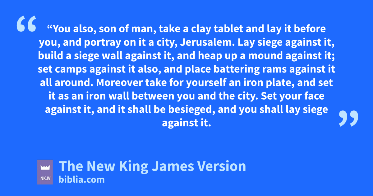 4 “You also, son of man, take a clay tablet and lay it before you, and portray on it a city, Jerusalem. 2 aLay siege against it, build a bsiege wall against it, and heap up a mound against it; set camps against it also, and place battering rams against it all around. 3 Moreover take for yourself an iron plate, and set it as an iron wall between you and the city. Set your face against it, and it shall be cbesieged, and you shall lay siege against it. dThis will be a sign to the house of Israel.