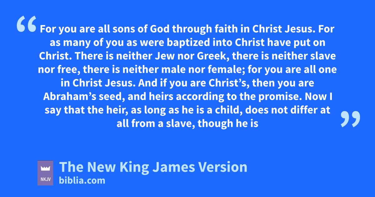 26 For you iare all sons of God through faith in Christ Jesus. 27 For jas many of you as were baptized into Christ khave put on Christ. 28 lThere is neither Jew nor Greek, mthere is neither slave nor free, there is neither male nor female; for you are all none in Christ Jesus. 29 And oif you are Christ’s, then you are Abraham’s pseed, and qheirs according to the promise.