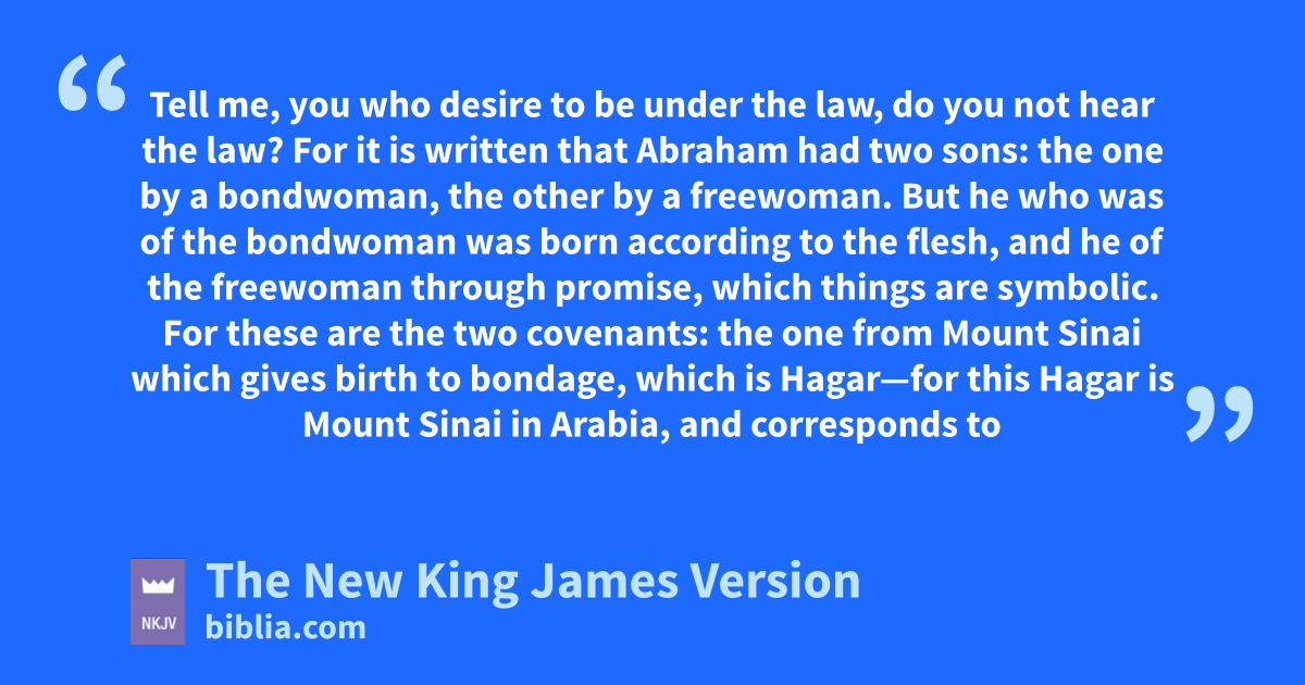 21 Tell me, you who desire to be under the law, do you not hear the law? 22 For it is written that Abraham had two sons: wthe one by a bondwoman, xthe other by a freewoman. 23 But he who was of the bondwoman ywas born according to the flesh, zand he of the freewoman through promise, 24 which things are symbolic. For these are 7the two covenants: the one from Mount aSinai which gives birth to bondage, which is Hagar—25 for this Hagar is Mount Sinai in Arabia, and corresponds to Jerusalem which now is, and is in bondage with her children—26 but the bJerusalem above is free, which is the mother of us all. 27 For it is written: