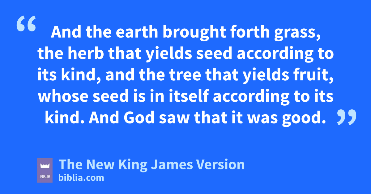 11 Then God said, “Let the earth nbring forth grass, the herb that yields seed, and the ofruit tree that yields fruit according to its kind, whose seed is in itself, on the earth”; and it was so. 12 And the earth brought forth grass, the herb that yields seed according to its kind, and the tree that yields fruit, whose seed is in itself according to its kind. And God saw that it was good. 13 So the evening and the morning were the third day.