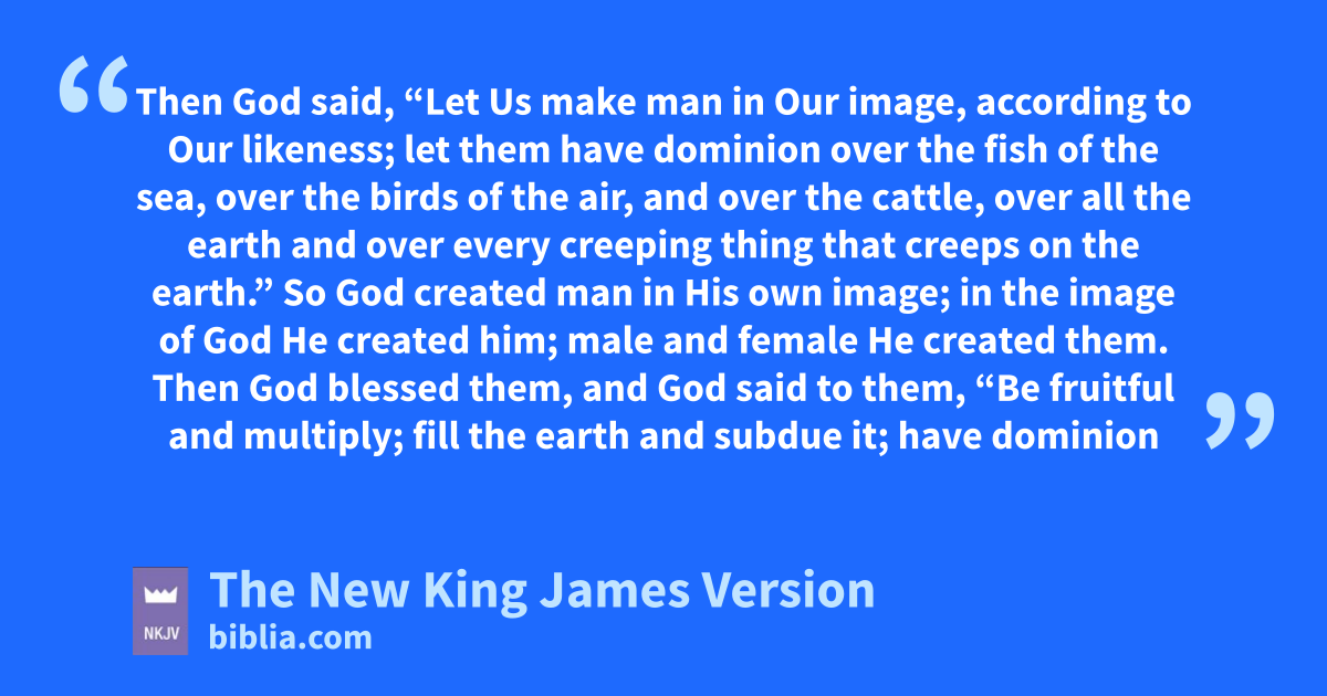26 Then God said, y“Let Us make man in Our image, according to Our likeness; zlet them have dominion over the fish of the sea, over the birds of the air, and over the cattle, over 7all the earth and over every creeping thing that creeps on the earth.” 27 So God created man ain His own image; in the image of God He created him; bmale and female He created them. 28 Then God blessed them, and God said to them, c“Be fruitful and multiply; fill the earth and dsubdue it; have dominion over the fish of the sea, over the birds of the air, and over every living thing that 8moves on the earth.”